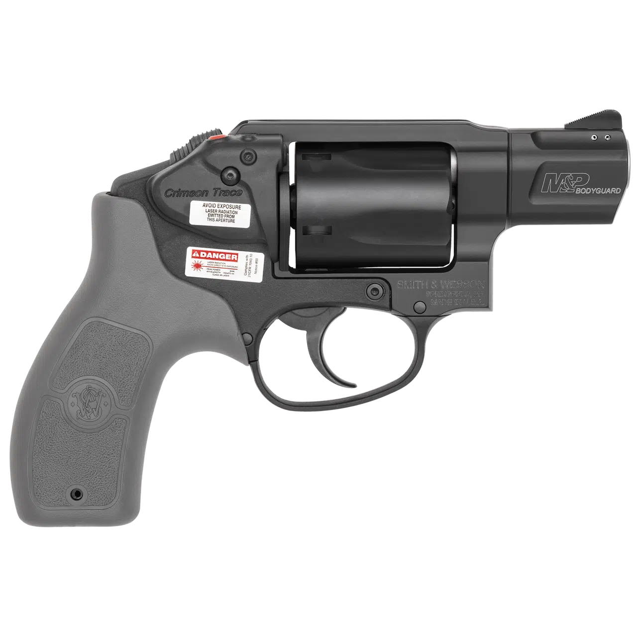 This Bodyguard model is a double action only with a 1.875″ barrel, black ramp front sight with an integral rear sight, one-piece aluminum alloy upper frame, ambidextrous cylinder release and black PVD coating. It has a one-piece, gray polymer grip with a red Crimson Trace laser.